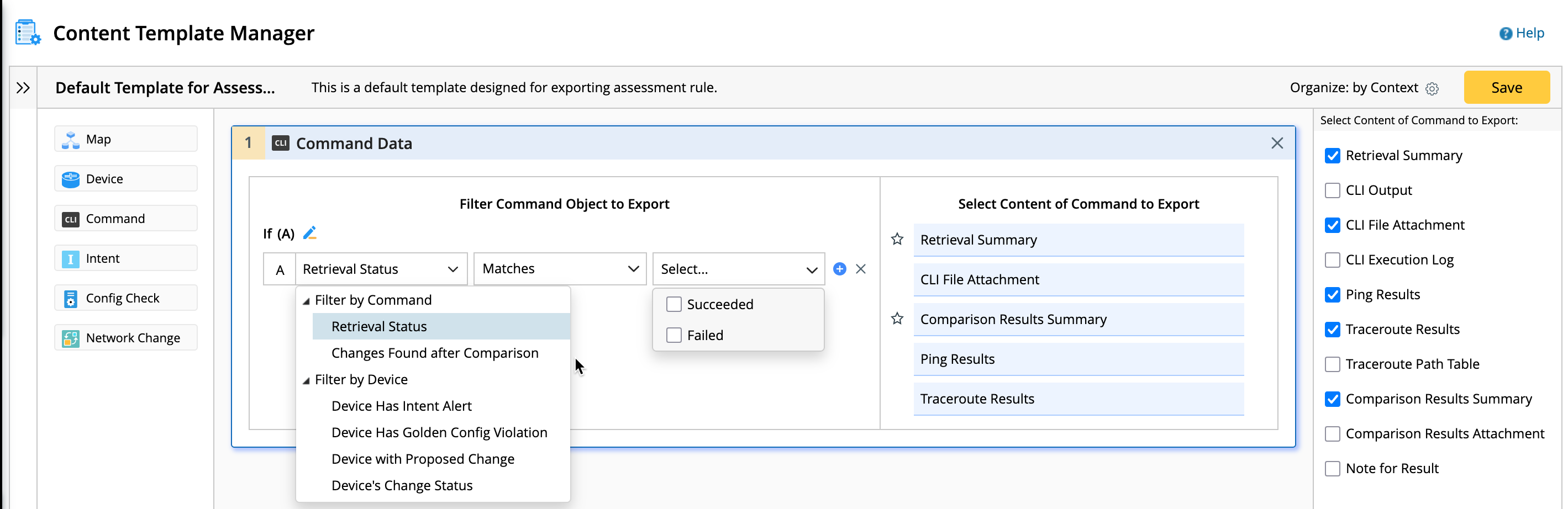 Command: You can execute multiple commands to retrieve data and filter the commands to be exported by command and device. And from the right pane, select the command content such as retrieval summary and execution log.