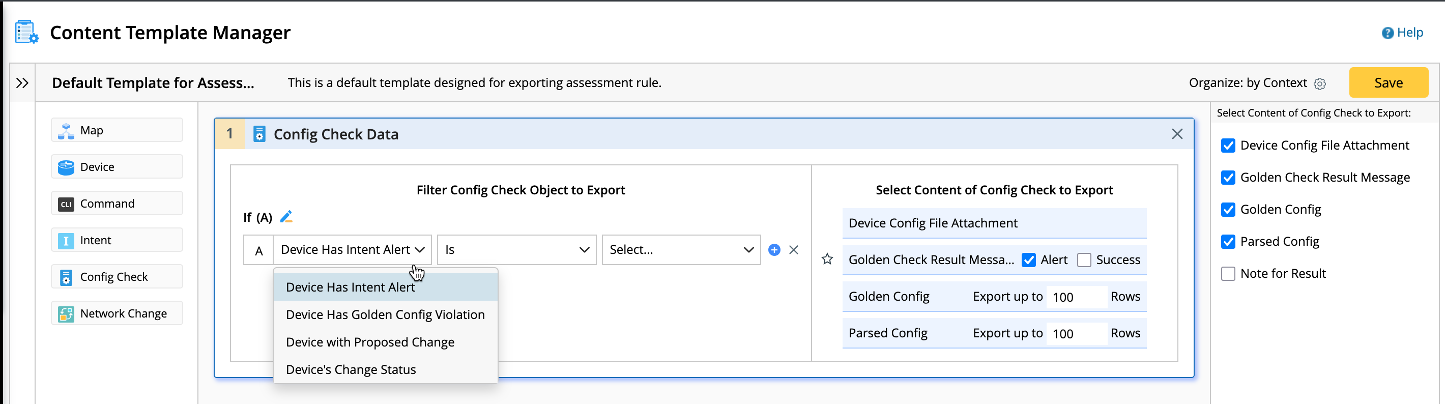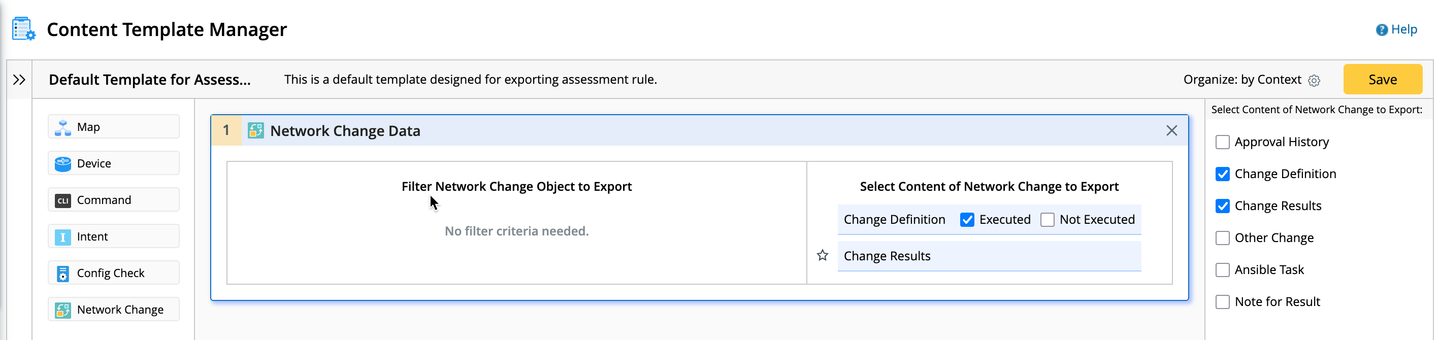 Network Change Object: This object does not require filter criteria, select the content to export.