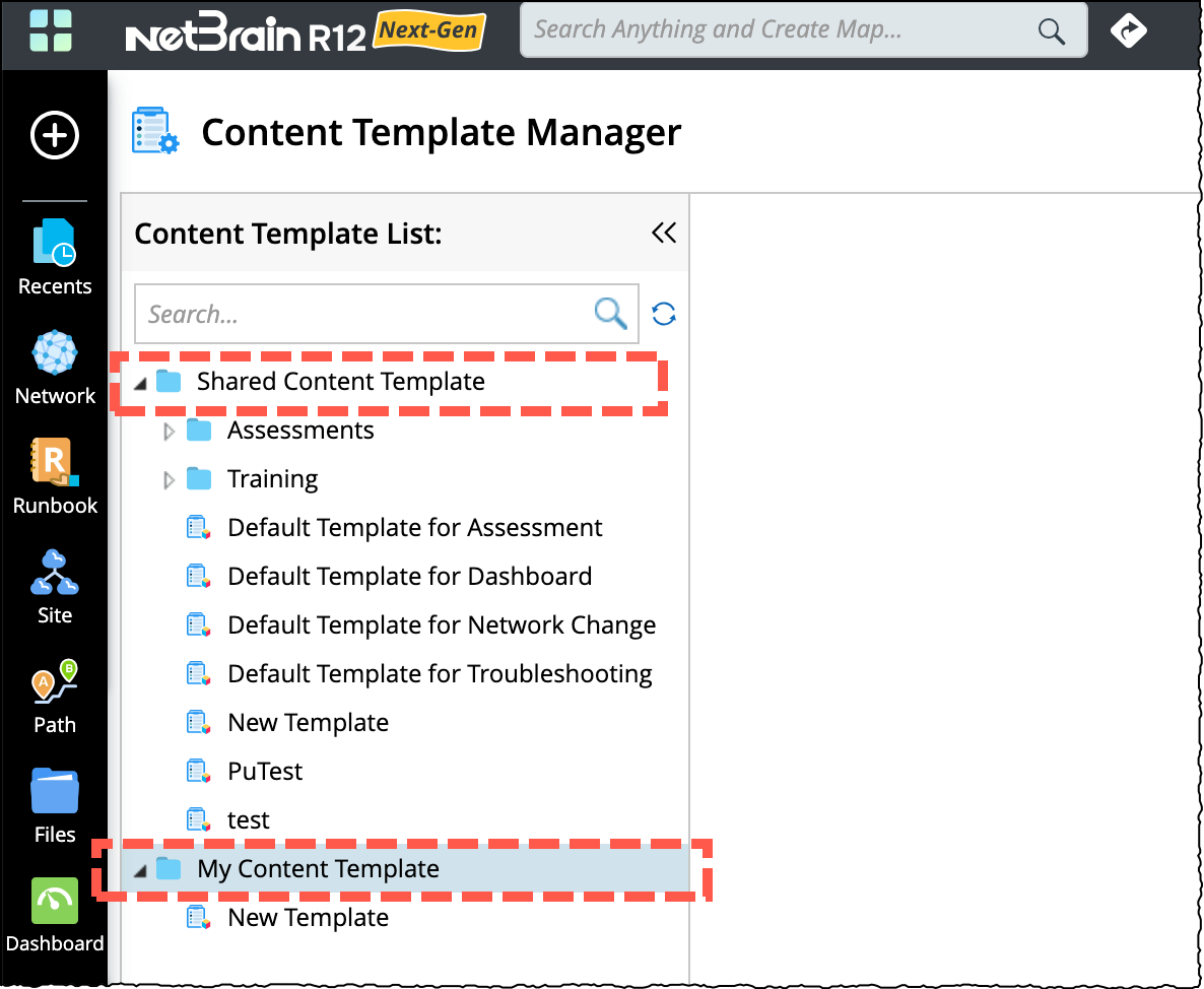 Content Template Manager is provided to pre-define and manage multiple templates. You can access it from the menu > Map-Based Automation > Runbook &Template> Content Template Manager and has the following privileges to manage each folder: