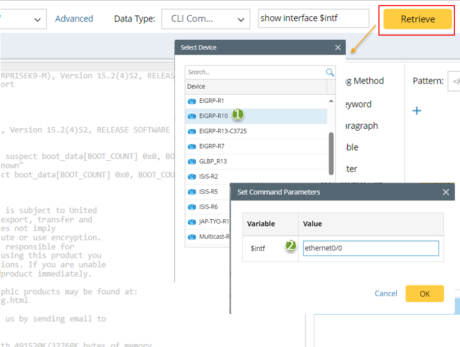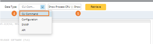 Note: The command input supports the commands with variables. For example, if the input command contains variable "$intf", you need to set values for the variables when you retrieve data.