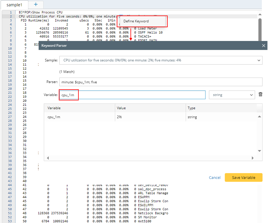 - Variable — the variable defined in the Parser. To change the auto-created variable name to a more meaningful name, rename the variable, such as from var1 to CPU_1m.