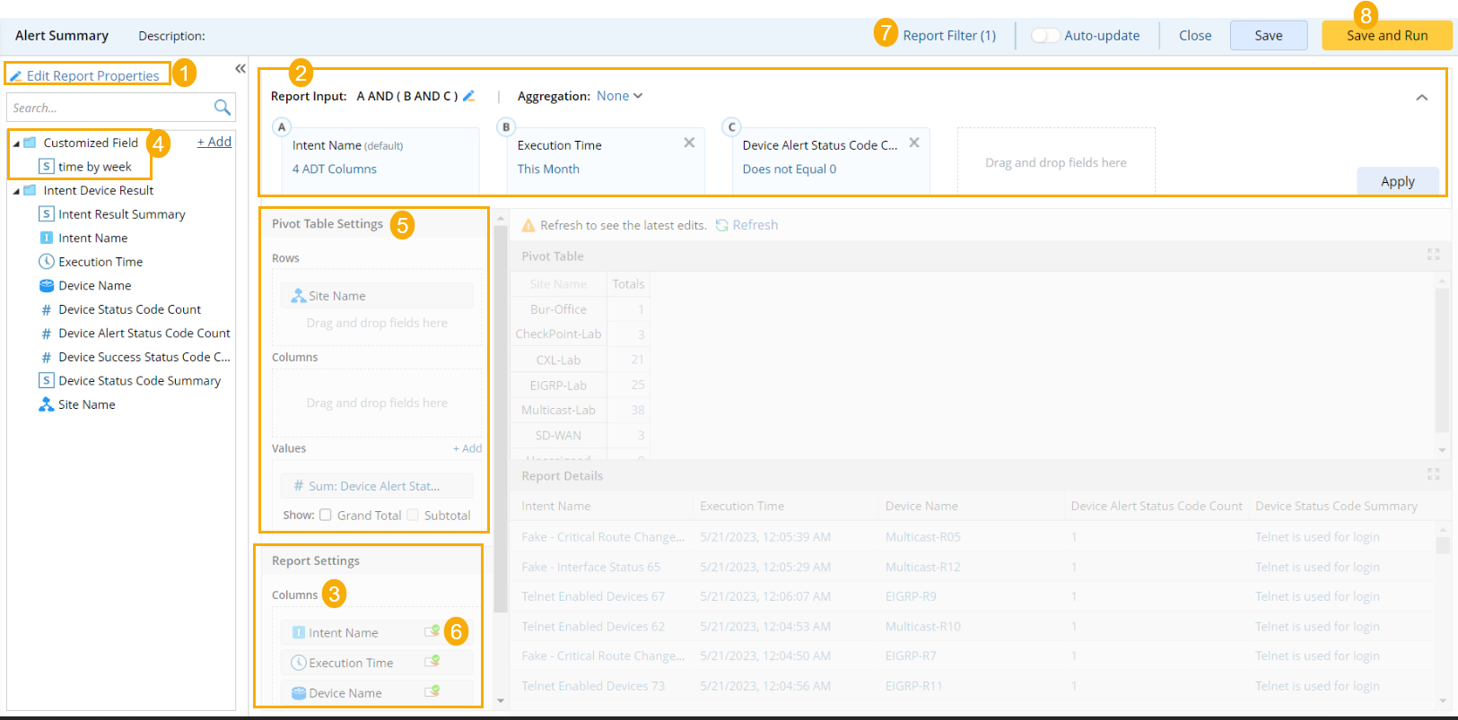 The report organizes data from different automation assets into reports, such as device, intent, application, change management, and site. Besides that, the Pivot Table in Report can help further analyze and summarize the report data.