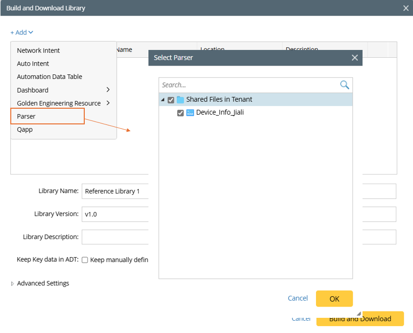 - Select one of the following resources to build the library. You can repeat this step to add multiple resources, the resources will be categorized and displayed in the table node structure in the Build and Download library dialog: