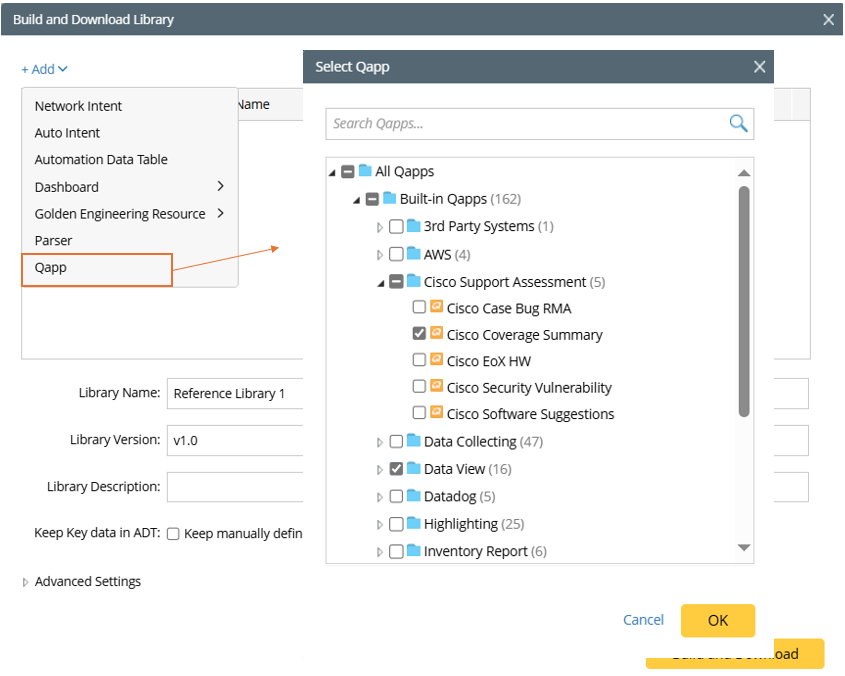 In the Build and Download Library dialog, Click + Add menu to access the resources to build the library: