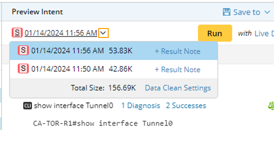 After an intent is created via intent replication, the Run & Save intent pane will automatically unfold to the right, where intent details are displayed. Click Run to run the intent, then you can go through the execution results in this pane. The Run settings can be configured by clicking the Live Data option next to the Run button.