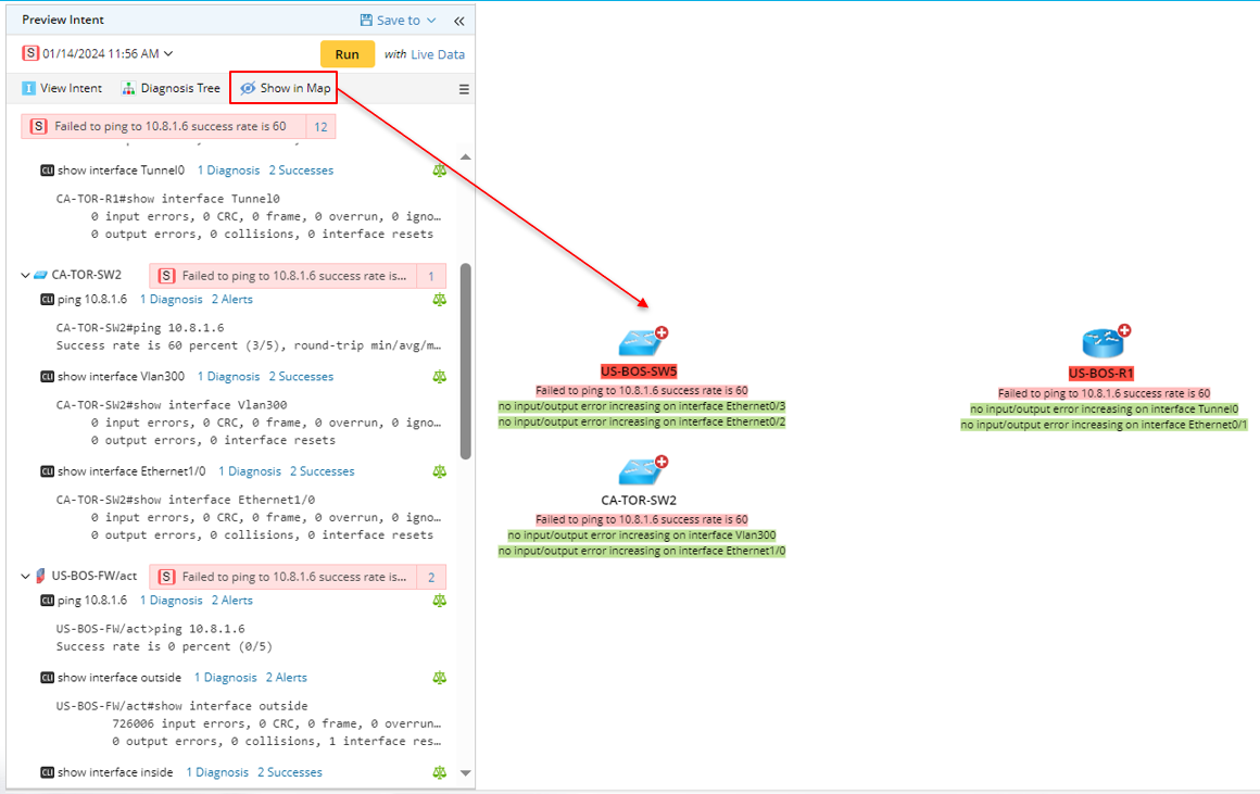 The intent execution results can be viewed in the post-execution Diagnosis Tree or the Map.
