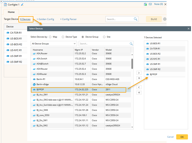 - The selected devices are added to the Device column in the Configlet Node table.