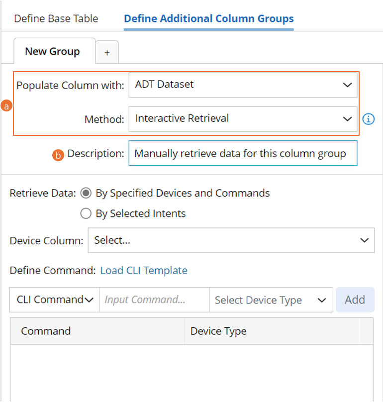 - By Specific Devices and Commands: Define the CLI commands and applicable device types. During manual data retrieval, the command data will be obtained per device based on the corresponding device type.