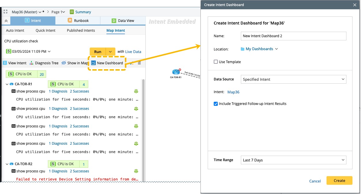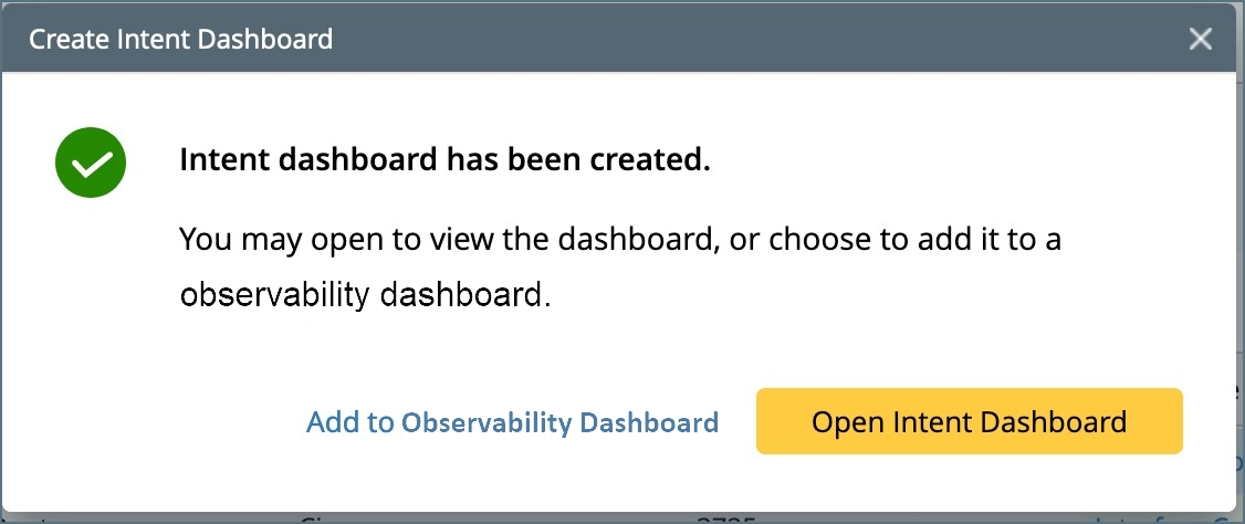 - Create the Intent Dashboard and choose either to Add the data to observability dashboard or Open Intent Dashboard.