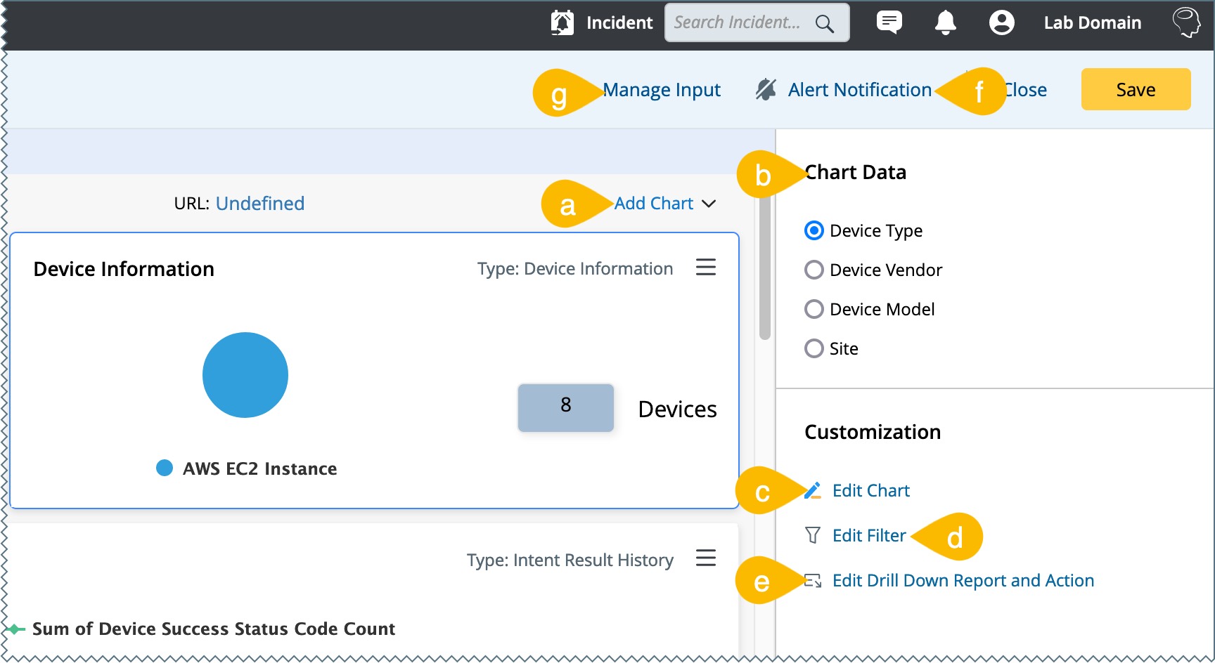 - Add the chart: By default, there are three charts for each type (device information, intent, intent result). You can add more charts. For example, you can add a chart for intent results and another for intent device results.