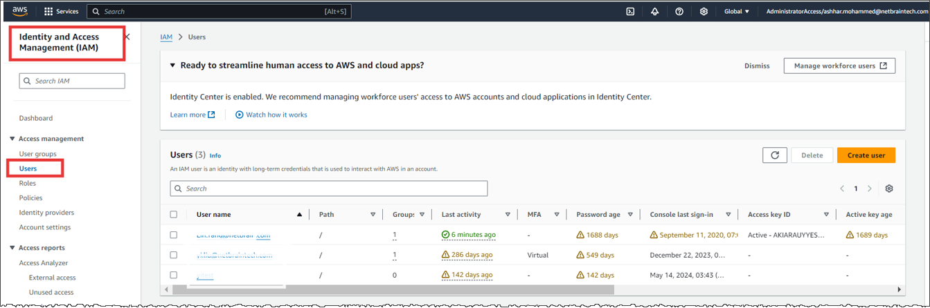 - Navigate to Identity and Access Management (IAM) in your AWS Management Console.