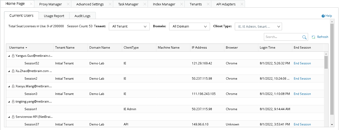- Log in to the System Management page. The Current Users tab is displayed by default. All online users in the system are listed, including user sessions, machine name, IP address, and more information. And you can filter the listed online users by Tenant, Domain or Client Type.