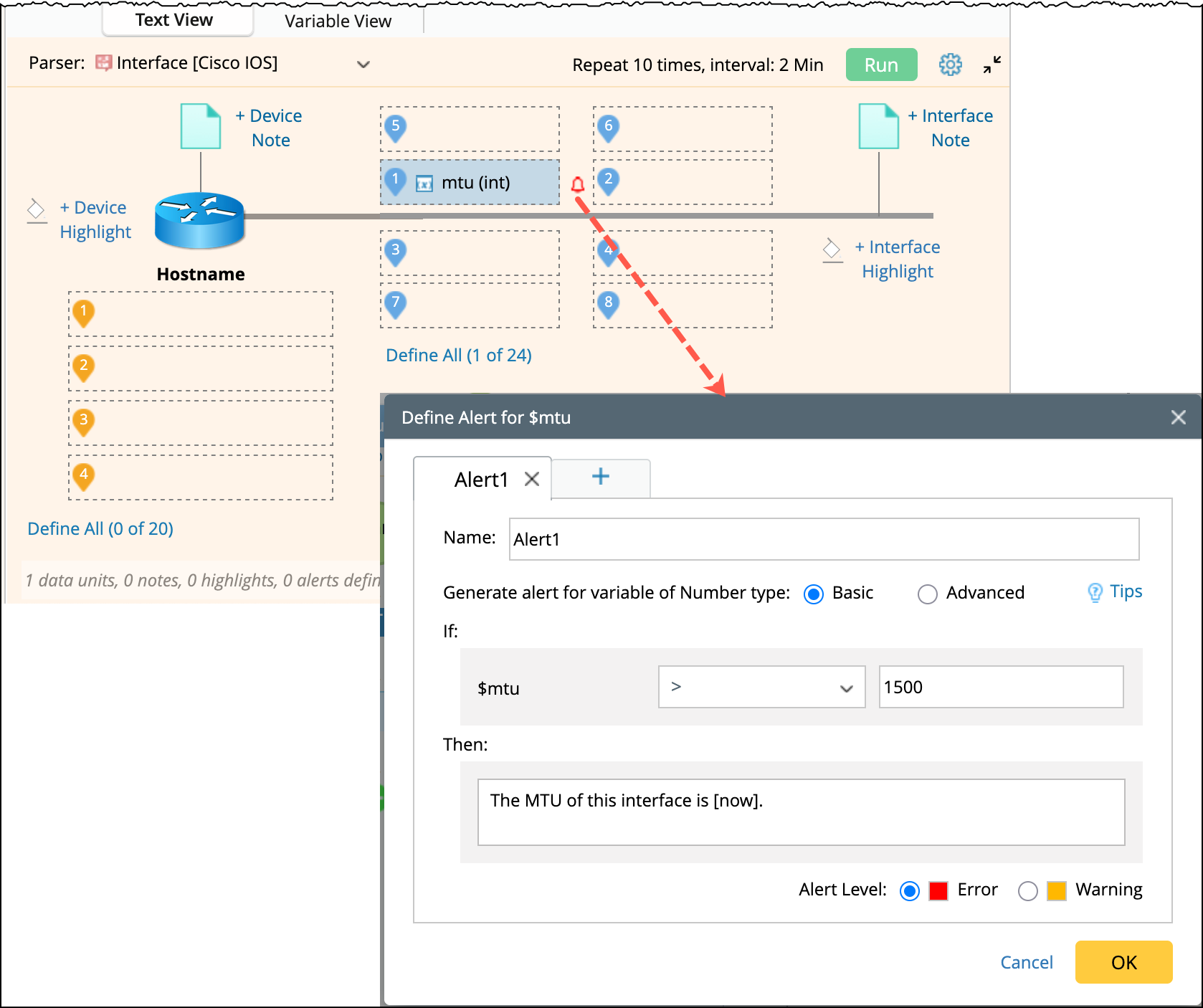 With the above alert definition, the "mtu" data unit shown on the map will be highlighted if the specified condition matched: