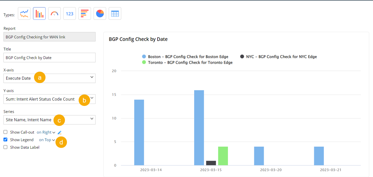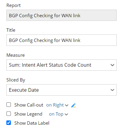 - Select the Series as Site Name and Intent Name and the chart title to BGP Config Check Alerts by Date.