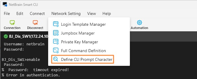 - On the Smart CLI window, select Network Setting > Define CLI Prompt Character.