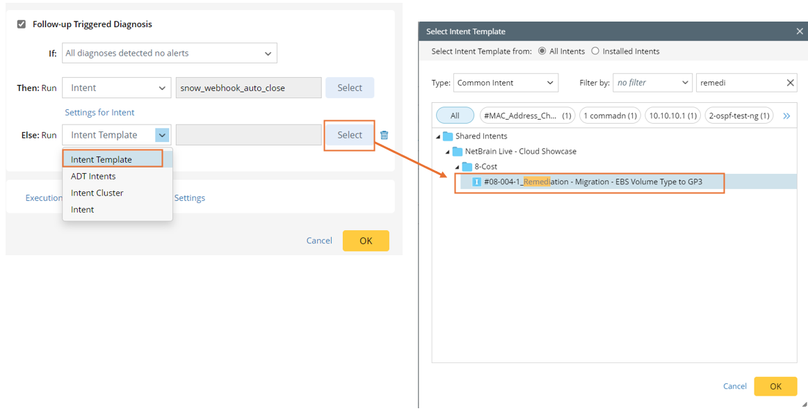to select an intent/intent template/intent cluster/ADT intents to run when the If condition is not satisfied. Then click Select to select the intent. In this example, intent template #08-004-1_Remediation - Migration - EBS Volume Type to GP3 is selected.