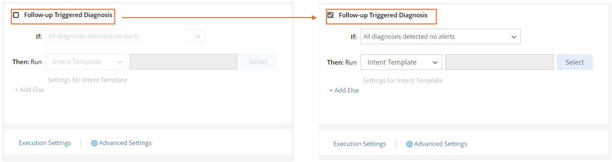 Follow-up triggered diagnosis can be defined for each triggered diagnosis to run four types of intents (intent, intent template, intent cluster and ADT Intents). During follow-up triggered diagnosis, another intent is run at request when certain conditions are satisfied to complete a task.