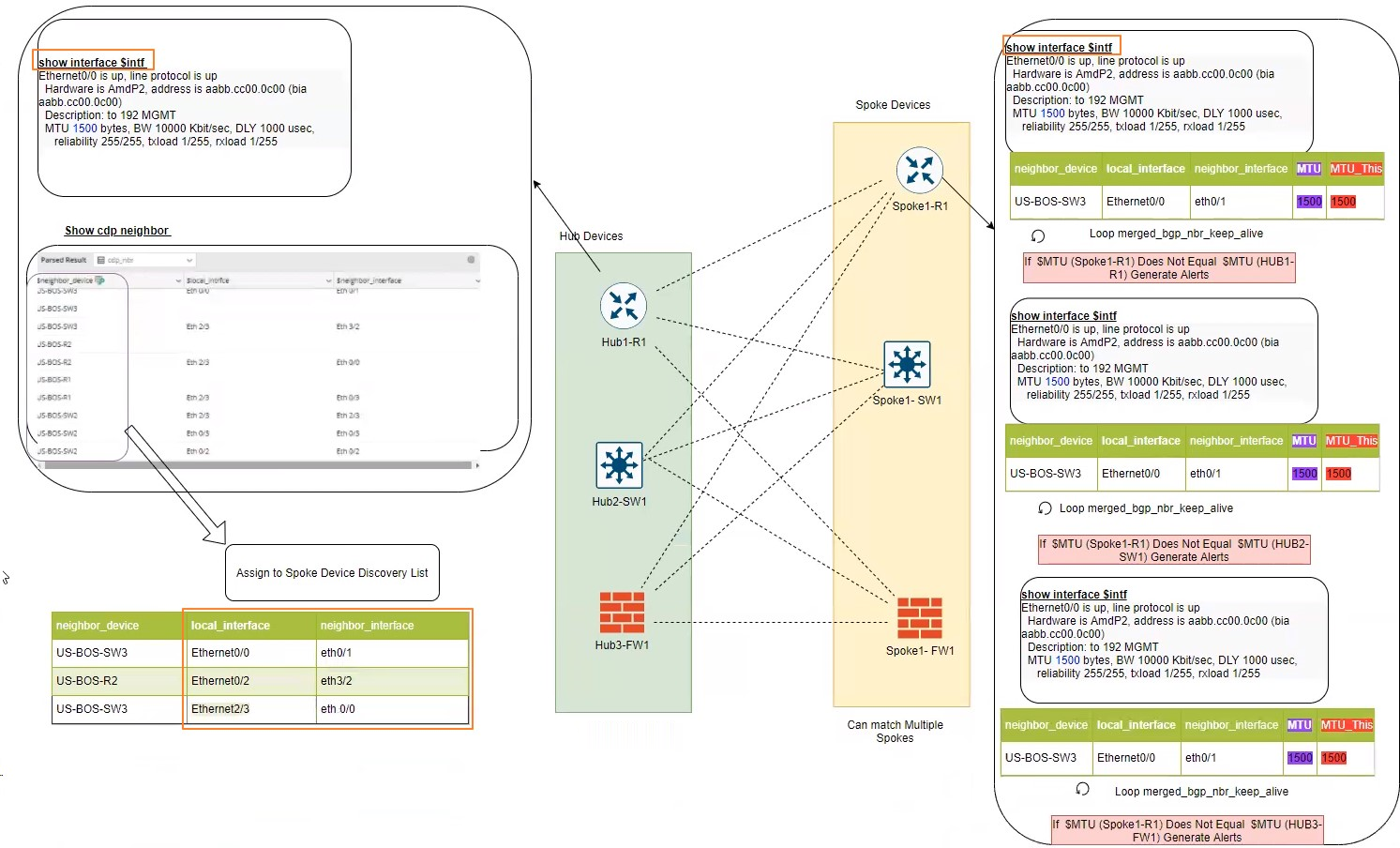 For example, the hub and spoke devices both use the command show interface $intf to get corresponding interfaces. You can select the neighbor_interface column for the spoke macro variable and select local_interface as the mapping column for the hub macro variable to find the relationship between them.