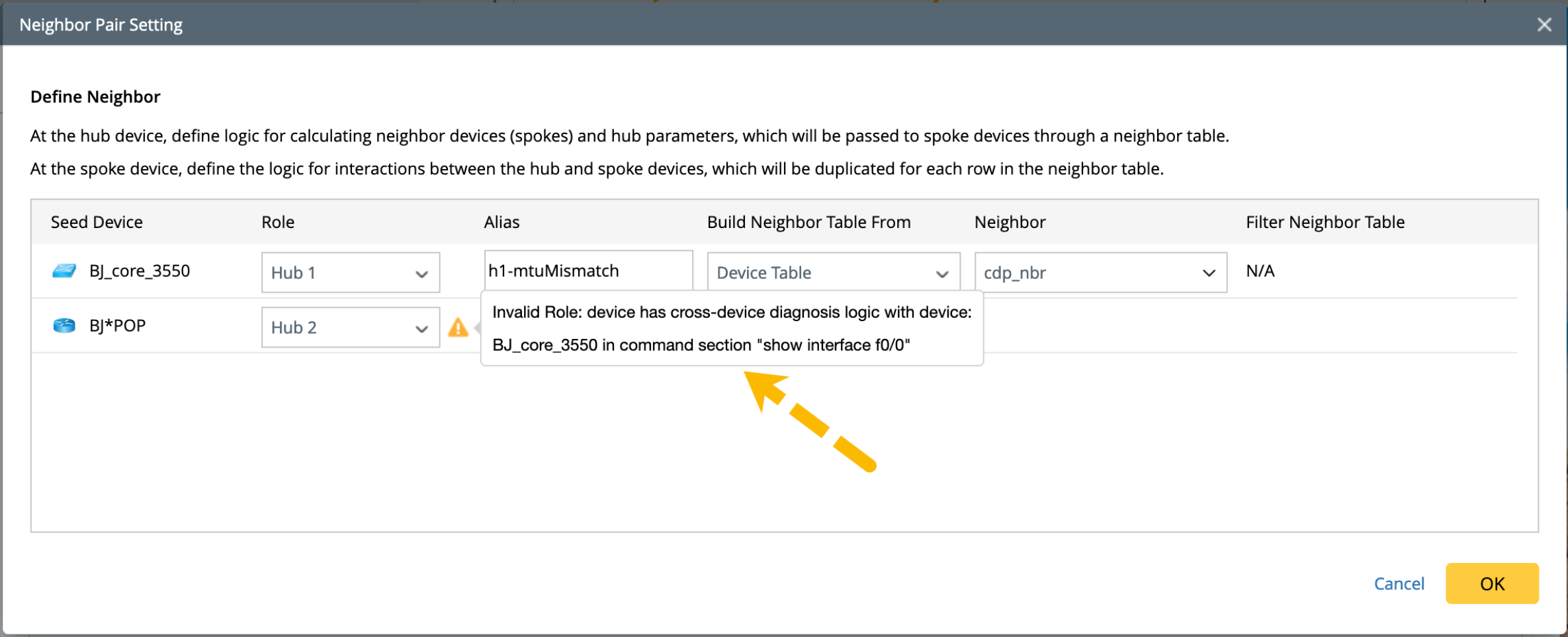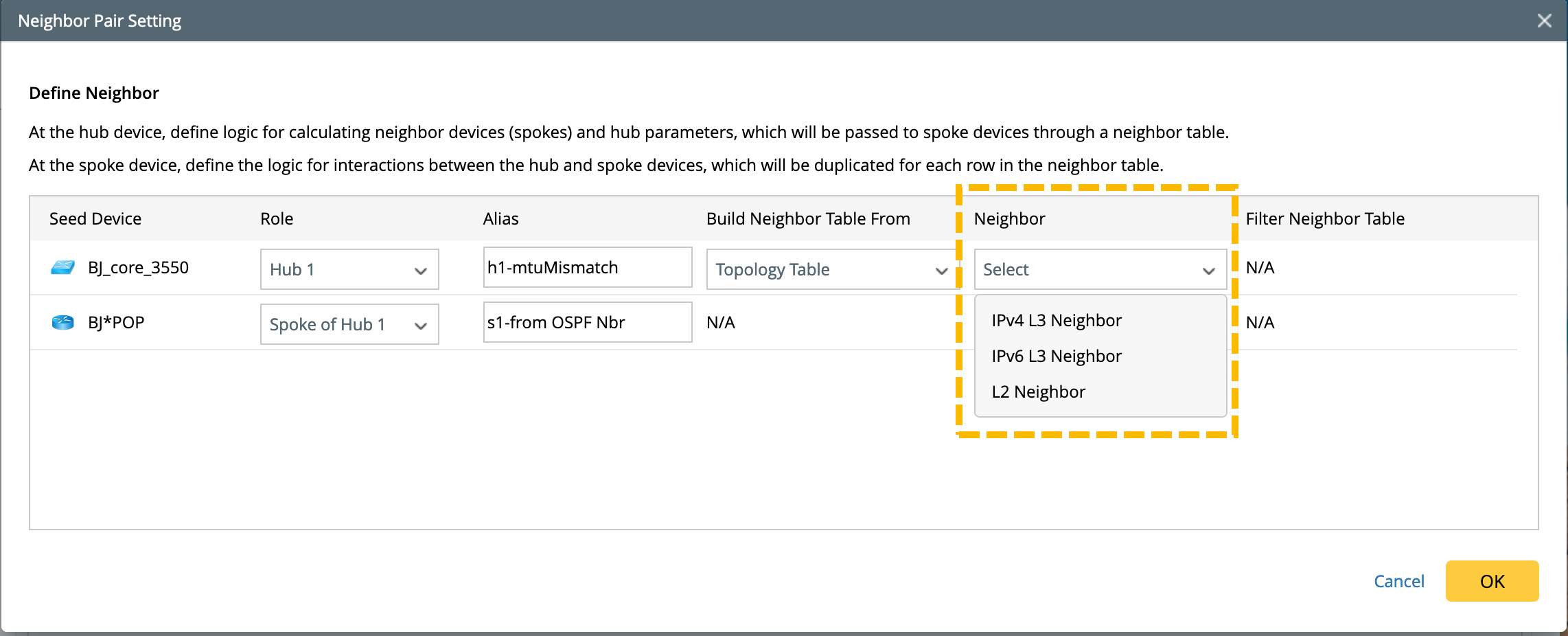 Neighbor Discovery Logic: If the IP addresses are selected as the neighbor column, the system will directly use these IP addresses as the hostname to discover the neighbor devices. When no devices are discovered, then use them as an IP to check whether there is an IP address match.