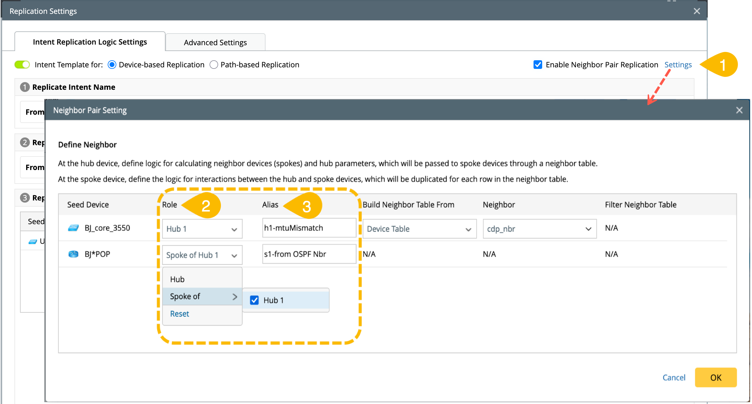 Define an alias for each seed device to display under the Replication Settings section inside the intent, making it convenient for you to view.