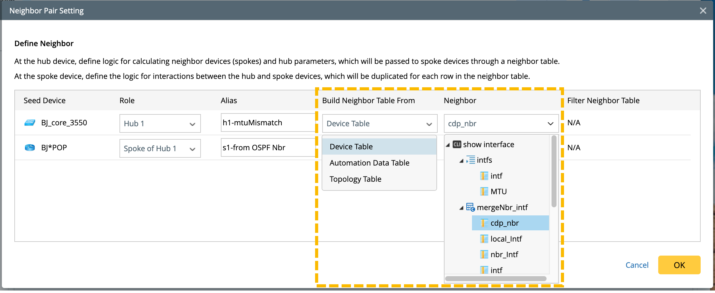When you select a table from the Device Table, all the tables in the hub devices will be listed in the Neighbor column for you to select, such as the parsed table, built-in table, merged table, and all other compound tables. The macro variable is supported in the command of the neighbor table, which will be explained in detail in Define Macro Variables for Hub and Spoke Devices.
