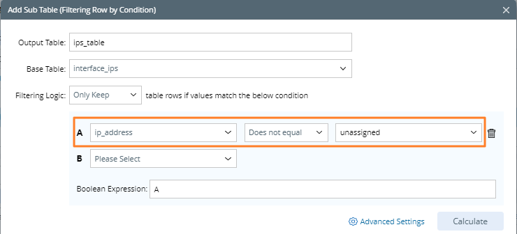 - Define a sub table (filtering row by condition) only to include rows with the ip_address values that are not "unassigned".