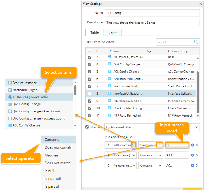 - Filter row By Advanced Filter: Define the conditions for filtering rows, then the rows meetings these conditions will be found. For example, to define Condition A, select All Devices (Device Role) column, select operator Contains, then type the match word 'DE'. With this Condition A, a role with the device role name containing 'DE' will be found and displayed in ADT view.