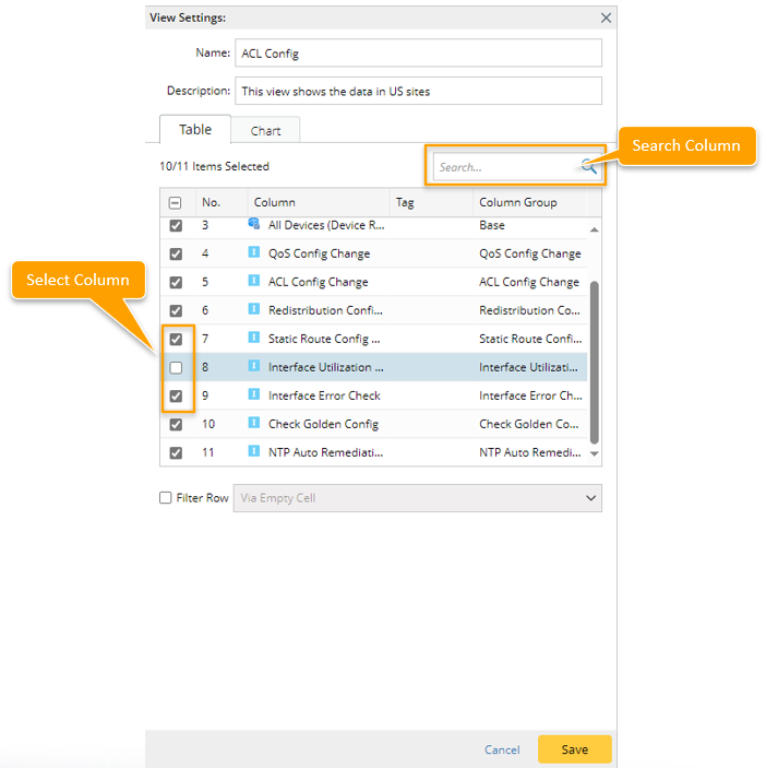 Note: The total number of selected columns is limited to 20. - Filter Row: Check the checkbox next to Filter Row to enable this function (this function is disabled by default), then you can define which rows will be shown in ADT view by the following two methods.