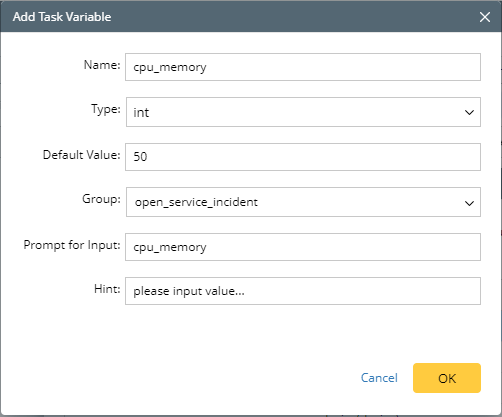 In the Add Task Variable dialog, define the task variable, such as name, type, and default value.