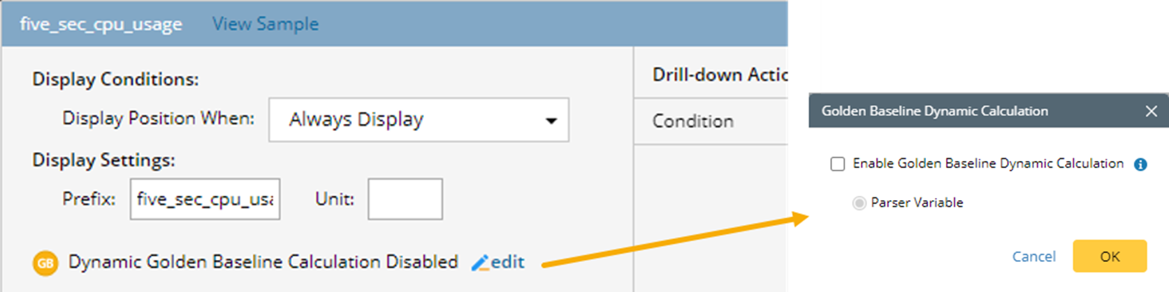 | Dynamic Golden Baseline Calculation Enabled | Enable or disable the dynamic golden baseline calculation for the variable. The following is a sample screenshot: Note: This setting only applies to parser variables. |