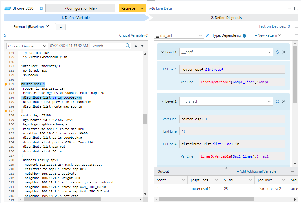 On the Define Variable tab for intent diagnosis creation, you can define different parsers, which will parse different variables. Add Parser from the Config and CLI command section and define the variables via Visual Parser. Visual Parser supports five types of variable definitions: Single Variable, Table, Paragraph, Collector, and Json Table. You can also directly click Auto Pattern to define a new parser via the auto parser function. See Add-on Parser for more details.