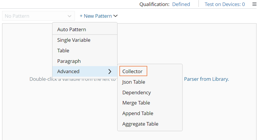 - Click + New Pattern > Advanced > Collector to select the collector parser type, then a collector pattern with an empty ID line will be created.