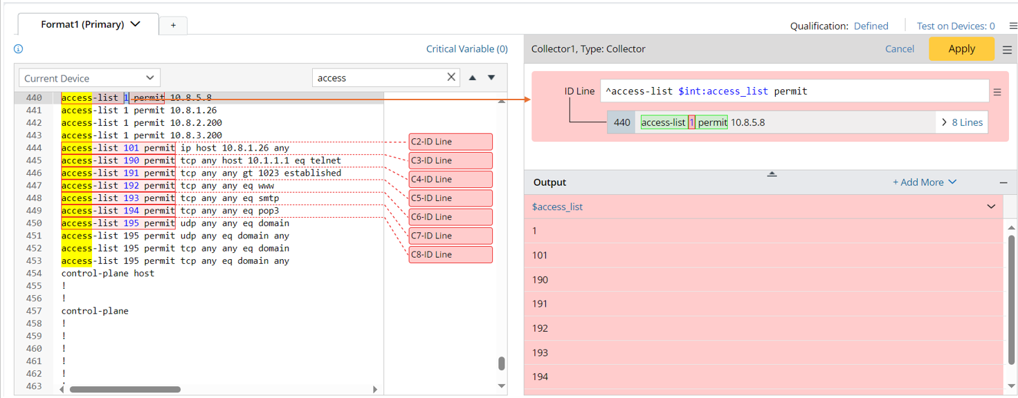 - Define ID Line Pattern: Click 1 in the line 440 to identify the recurring groups. The variable $int: access_list is parsed, and the command line containing this variable will be added to the ID line.