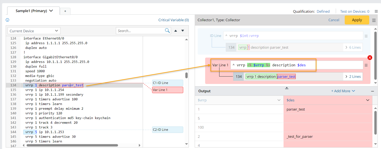 - Double-click 1 in line 134 to parse the variable $int: vrrp, then an ID Line is created, which will be used as the keyword to identify recurring groups. If you want to define an optional Parent Line, please refer to Parent Line for more details.