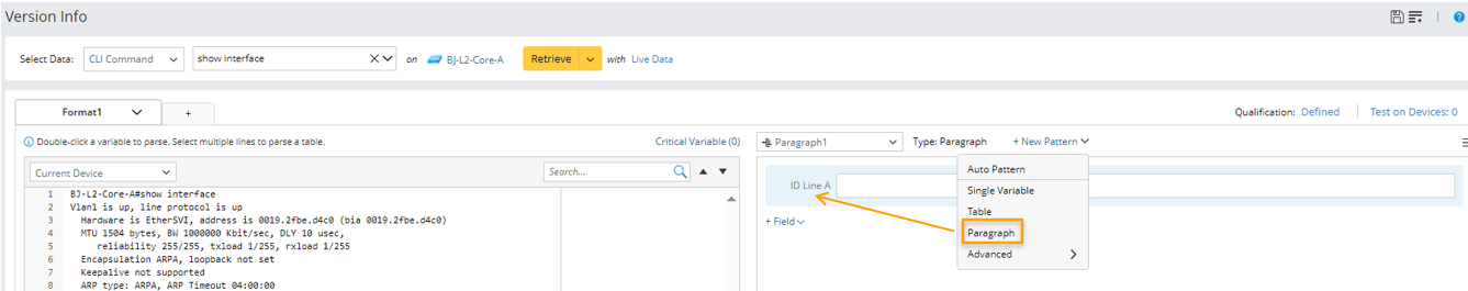 Follow the steps below to define a paragraph parser for parsing variables based on the sample output of the command (show interface) collected on the device BJ-L2-Core-A: