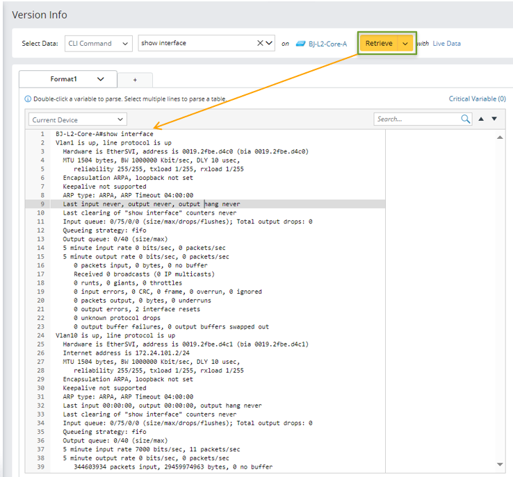 - Create a new parser, select the CLI command, enter the command 'show interface ', select the device BJ-L2-coreB, and retrieve the data.
