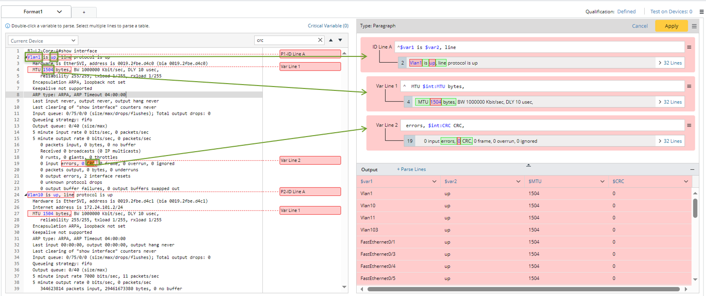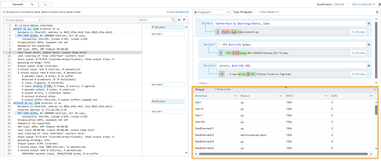 - Click Apply to confirm the parser definitions. Then check the output for interface information in the output area. The parsed result of a paragraph parser is in a tabular shape. The variables are defined in ID line patterns, variable line patterns.