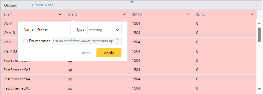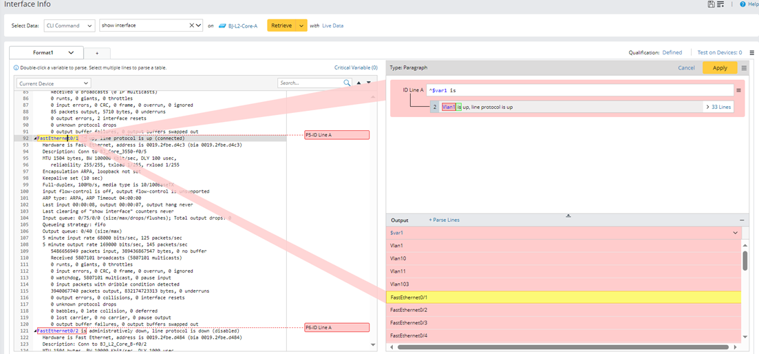 - In the Parser Input area, double-click "Vlan1", and "up" in line 2 to parser interface variables and interface status data, then an ID Line A containing multi-string variables $var1 and $var2 will be created.