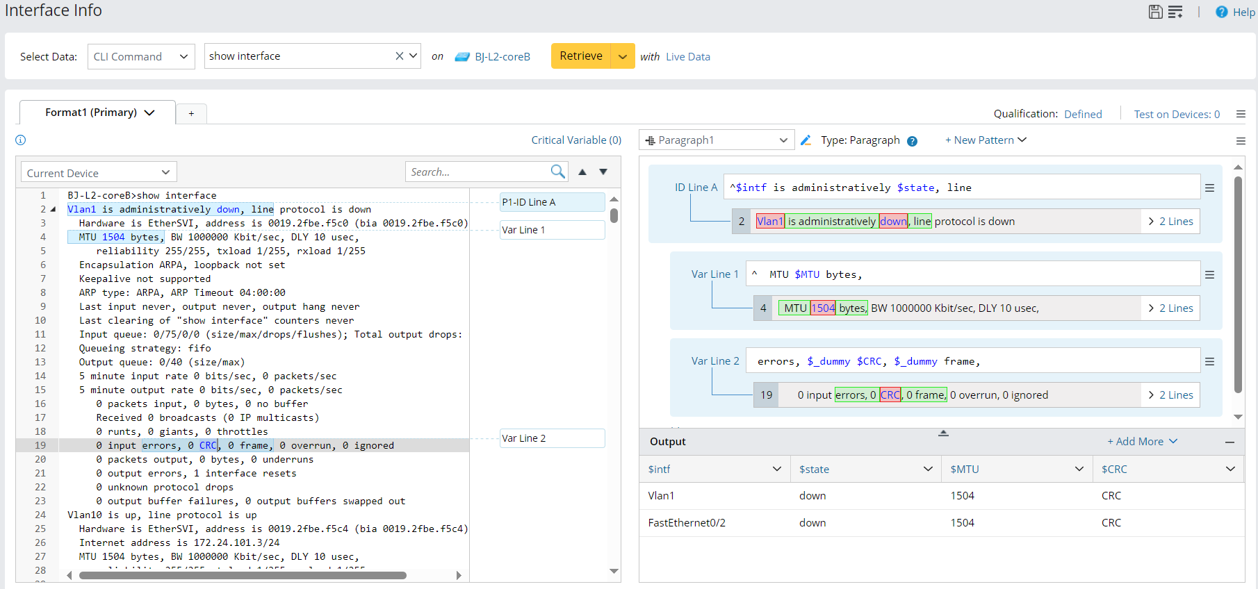 Use interface information as an example. You can define a Paragraph Parser to extract data from the interface output.