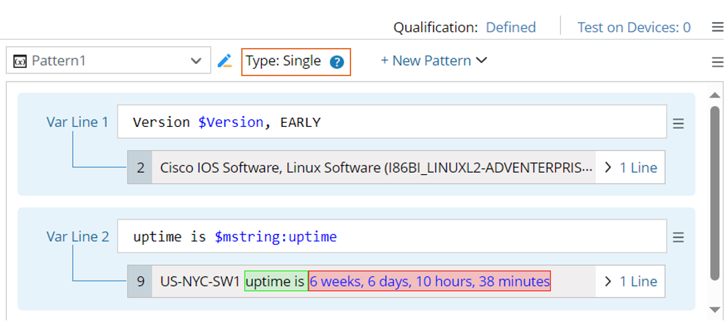 - Click Apply to create the pattern, then check the output for the previous device version and the uptime.