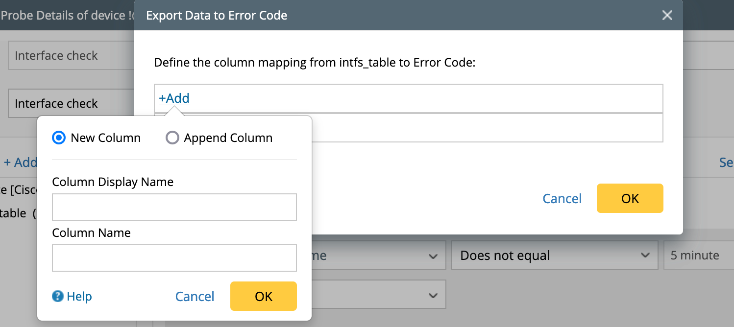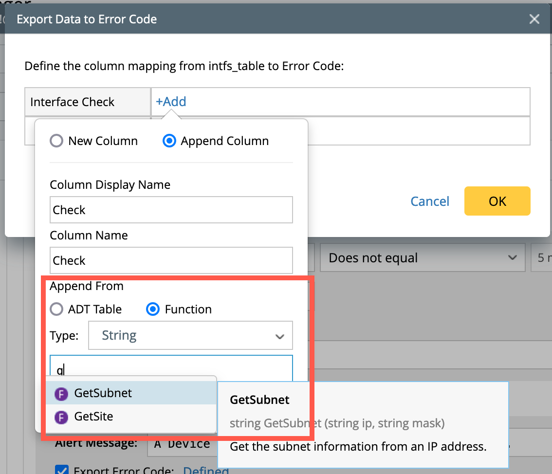 - Export Error Code: You can export the alert contents via the Error Code. The new error code column can be defined from the table or a single value used in the If condition as follows: