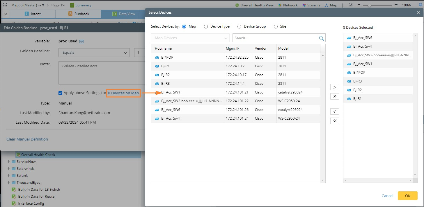 After applying a data view template to a map, let’s take the Overall Health Check Data View as an example. You can define Golden Baseline Rule for parser variables and apply the rules to devices/interfaces on the map.