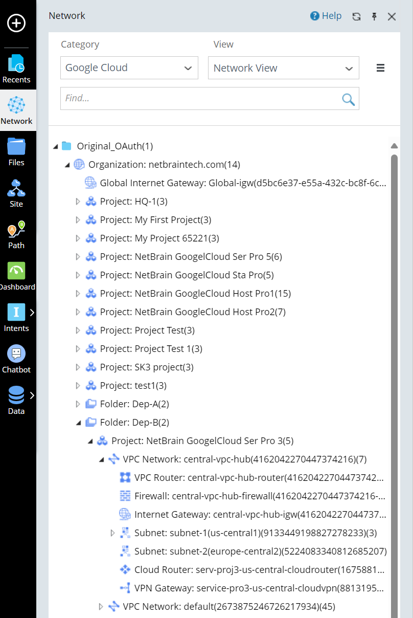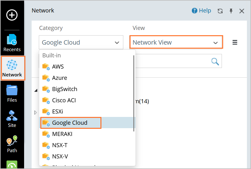 - Open the network tree and select Google Cloud in the Category field to view the GCP resource. Select Network View in the View field.