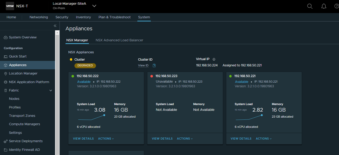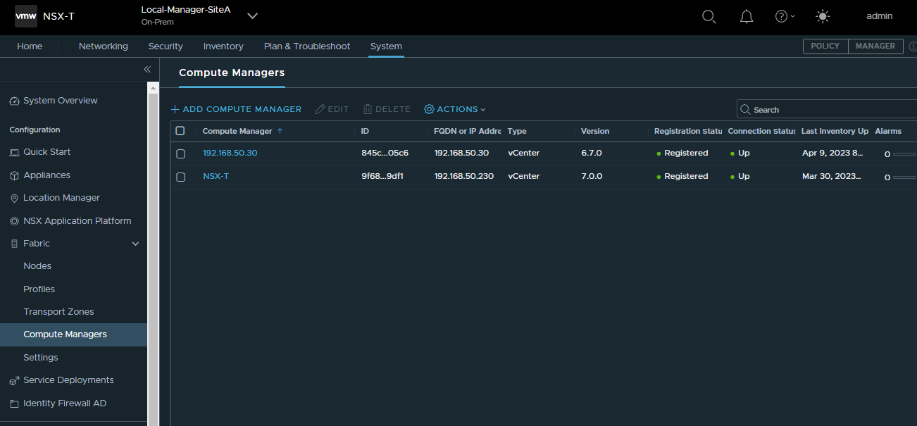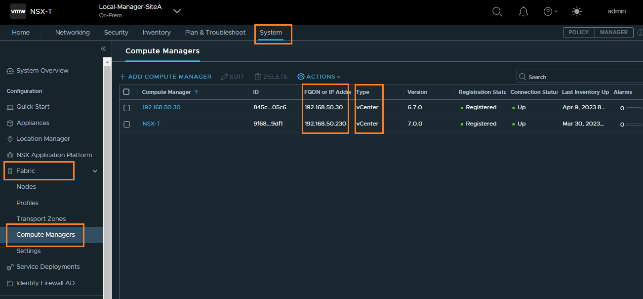 Because the NSX-T is built on the top of VMware ESXi, NetBrain need the access to the vCenter also. You can find the related vCenter FQND or IP Address (Transport Manager) from NSX-T Local Manager GUI in following pictures: