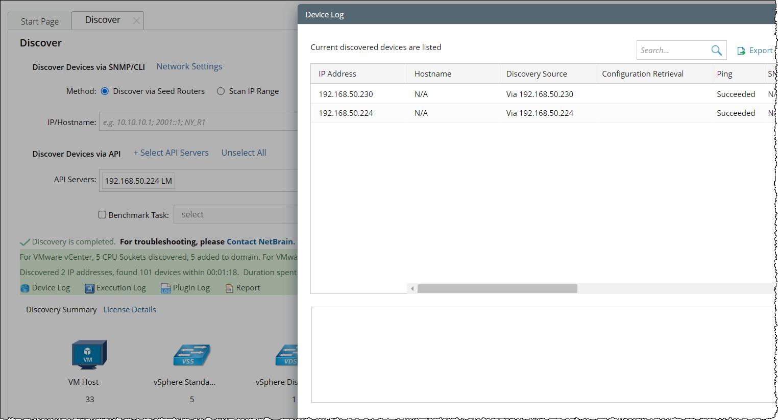 The vCenters and NSX-T discover logs can be found in the Device Log.