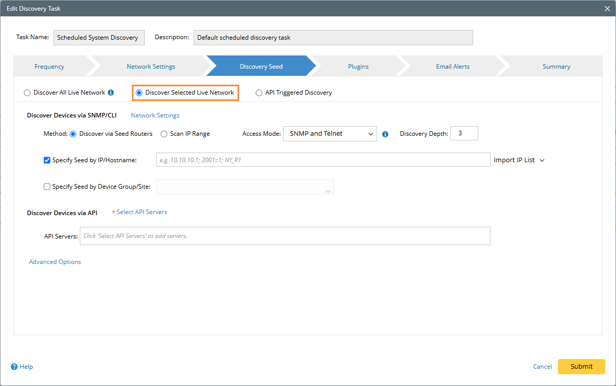 This functionality offers to discover certain IPs using Discover via Seed Routers, Scan the IP range or Discover Devices via API. To configure the settings, see Discovering Network Devices for more details.