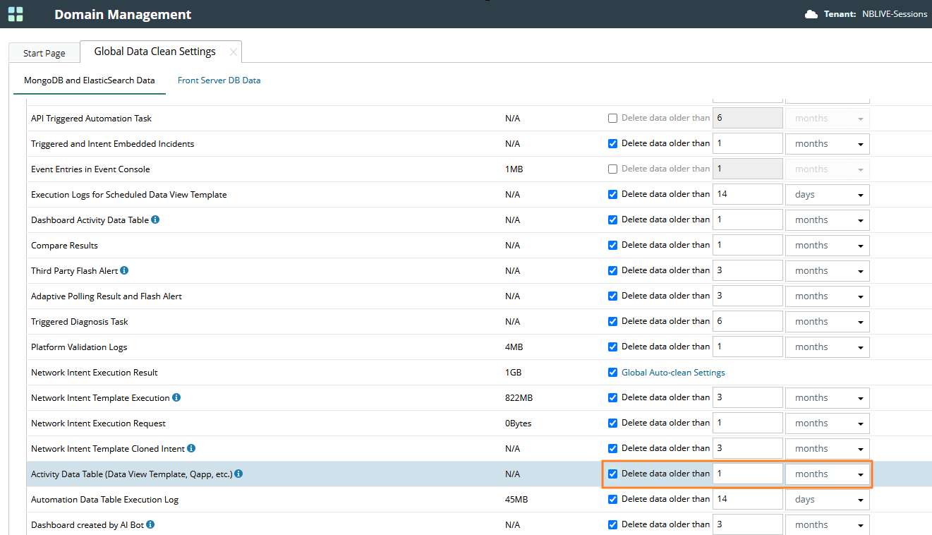 To avoid performance problems caused by more and more intent execution data, auto-clean the intent execution request in the Domain Management page > Global Data Clean Settings. This logic is enabled by default, and the default time is 1 month.