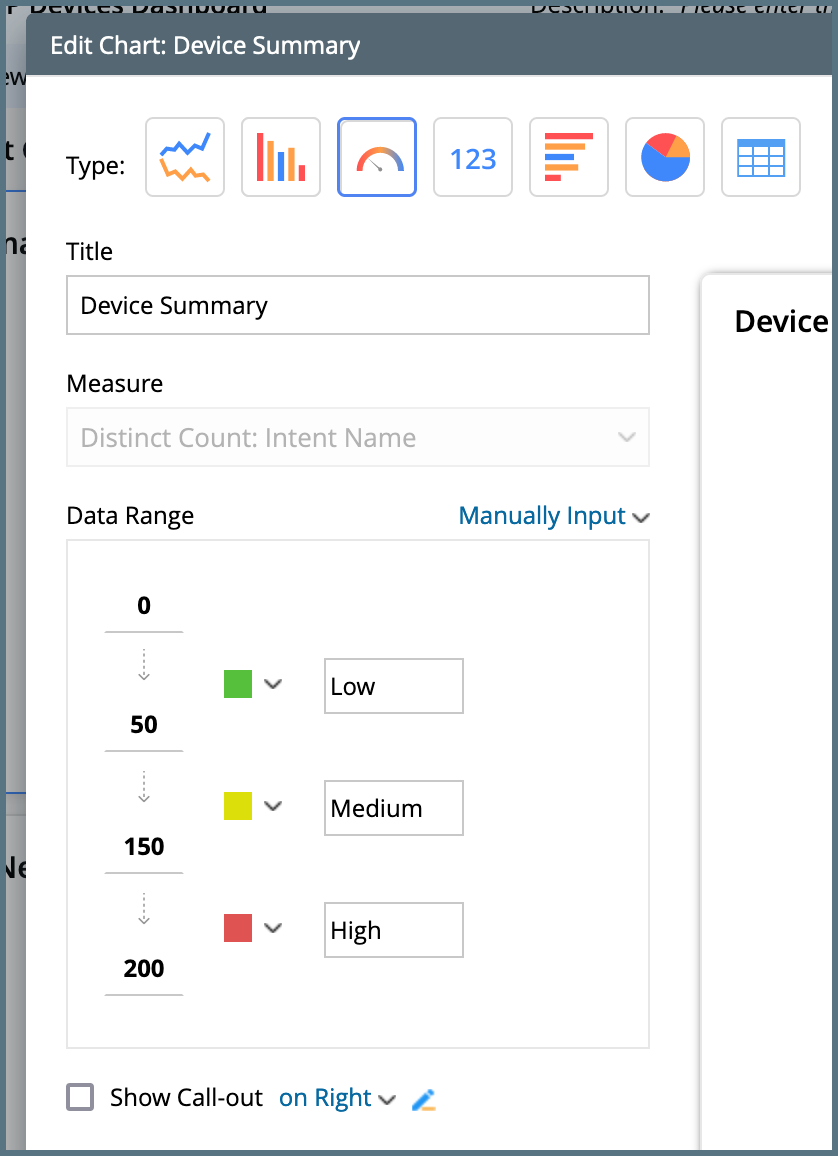 In Edit Chart dialogue, users can modify the chart settings such as chart type, chart title, call-out, etc. It also displays the chart data settings such as the x-axis, y-axis, etc. The table below illustrates the data displayed and defined in Edit Chart Dialogue. The chart setting is like the standard Dashboard