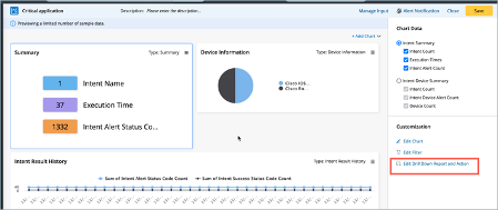 For all the charts displayed on the Intent Dashboard, an option is provided to edit the drill-down report and action by selecting a chart. To edit, click Edit Drill Down Report and Action to open its interface window.