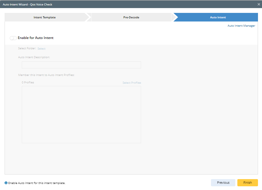 After configuring all the settings, click Finish in the lower-right corner to enable the intent template for auto intent and close the wizard.
